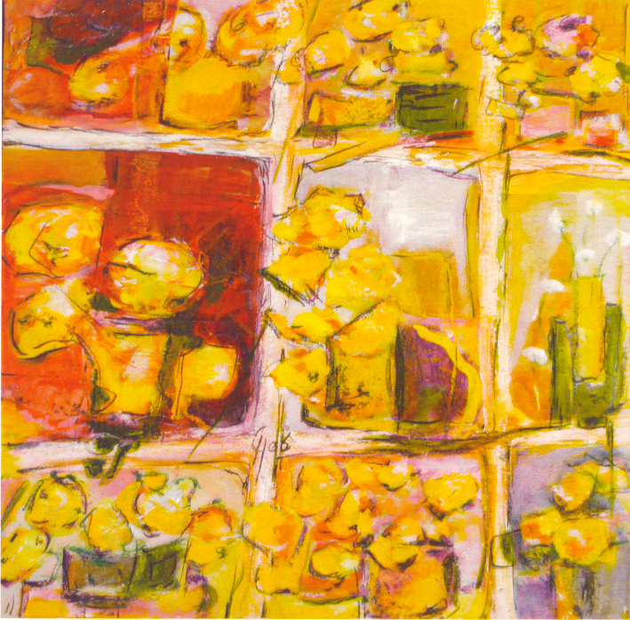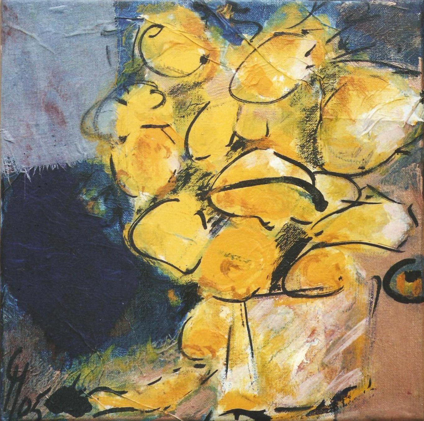Gele bloemen, mixed media op doek, 30 x 30 cm.-1